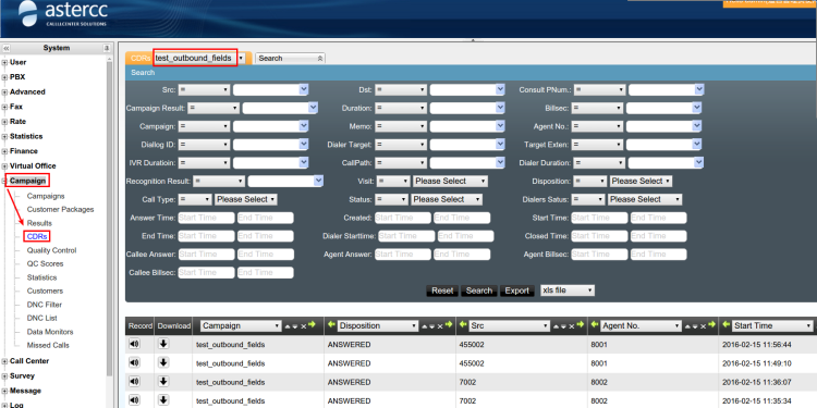 Click [ Campaign ]→[CDRs],you can open the page and view the call detail record(CDRs) of campaigns by change the select on top