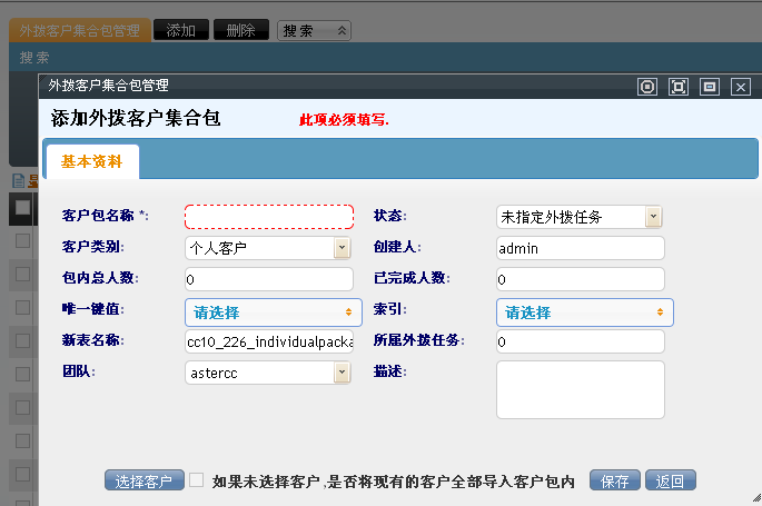 客户包:客户包就是从个人客户总表或企业客户总表按一定规则一定需求,选取一批客户进行打包,打包后可以为某个计划服务,用于外呼。每个外呼计划都会对应一个客户包,每创建一个包,系统就会自动为其建立一个数据表,称为个人客户的分表或者企业客户的分表,建立新表的目的是为方便管理自己的客户群,还能保护主表原始数据不受到破坏。