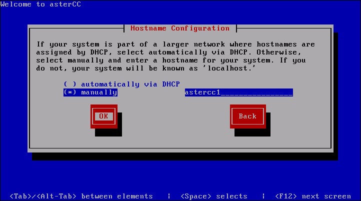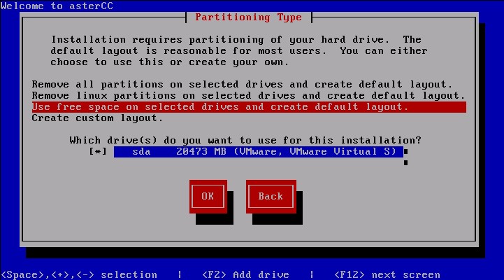 * select the partition, we select use free space her(you can also select to use the entire hard disk, which will remove all existing partition), use Tab to switch between the options. select OK to continue