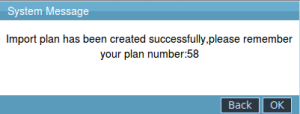 13.When you importing customer details successfully,the system will prompt that “Import plan has been created successfully,please remember your plan number:xxx”,as it shown below: