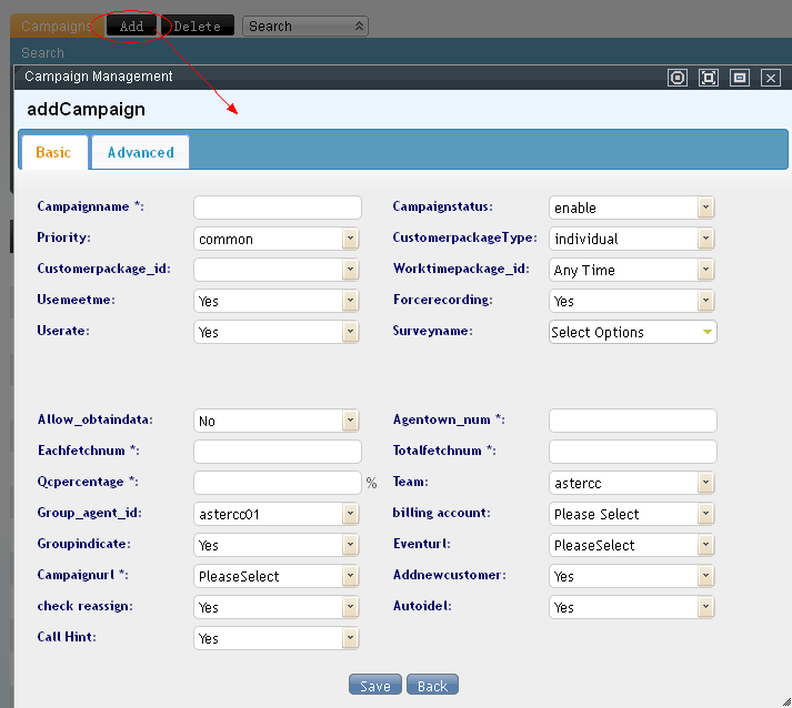 At the system management interface, click “add” at the “Compaigns” page. Then start to configure it:
