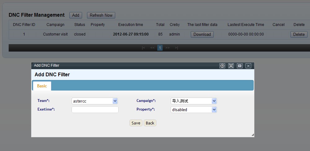 同样建立后的数据 ,如果当前状态 不是 正在取消的,都可以通过双击编辑 对应数据列表的 执行时间,重新选择执行时间.重新选择执行时间后,该条 黑名单过滤计划的状态将会变成 新的,并且是可用的.对于已经执行完毕的 数据,可以在 最近一次过滤数据列 里 点击 下载 ,来查看上次过滤掉的客户数据