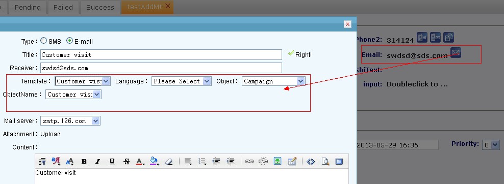 In the sms or email sending page, agent chooses a template, and the system will add the subject and contents into the page. If this template do not allow modify, then it shall be sent exactly the same as it has been set. If modify is allowed, agent can change some variables and then send.