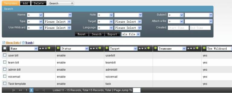 Application template includes tasks, bills, voicemails, working as the notice function of the corresponding modules in the system. When you need to redifine these templates, you can refer to the default templates of the system: add a new template, and change the status of the default template to Disable, and enable your new template. Next time the system would use your new template to send messages.