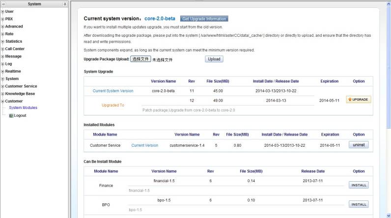Installed Modules: show the installed modules in the system.(the system upgrade to the next version,the installed modules will show the upgrade information if there is the upgrade)