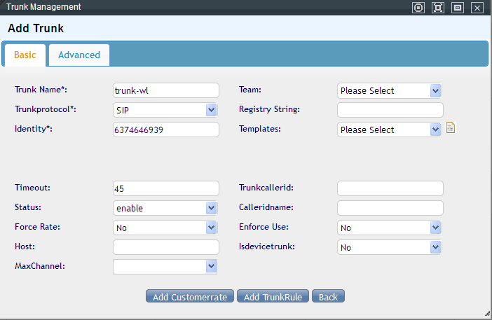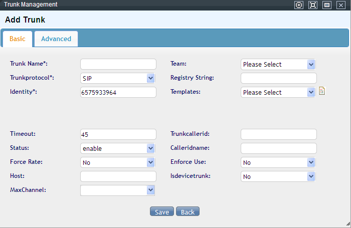 Enter a name for the trunk to distinguish it from others, and choose which team it belongs to. Choose the protocol which you would like to apply to the trunk, SIP by default. The identity is generated by the system automatically. You can use the default templates as your trunk templates. Status is for you to decide if you would like this trunk to work. Others are optional to fill out.