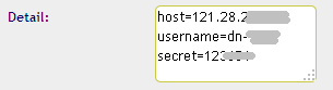 host=121.28.. the server address where to register the number, so that Asterisk can find the telephone. username=dn.. User name secret=123.. Password
