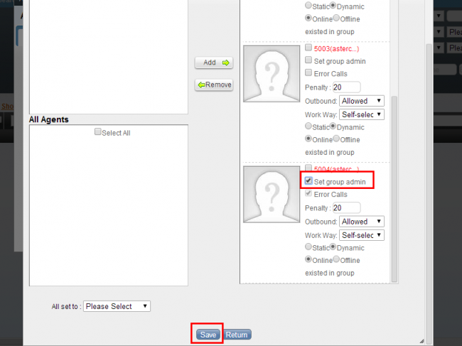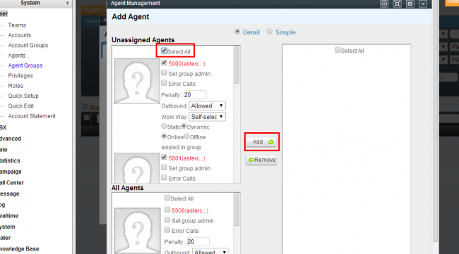 • Click [Add], it will move all agents into the agent group, we check [group admin] for 5000, 5001.