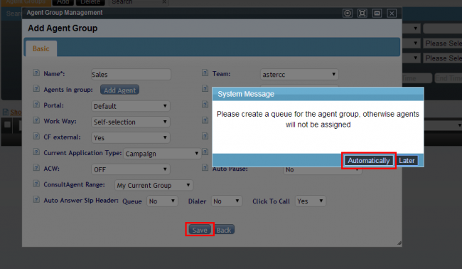 • When it's saved, it will prompt if you want to add a queue by system, the agent group only work with a queue, so we click [Add queue by system automaticly]