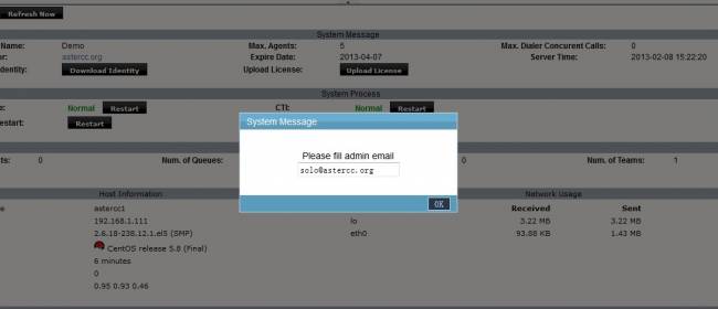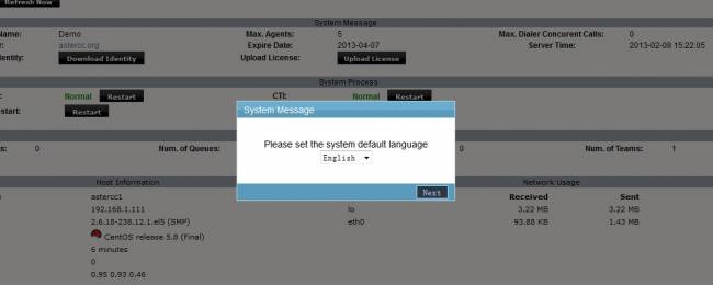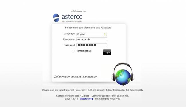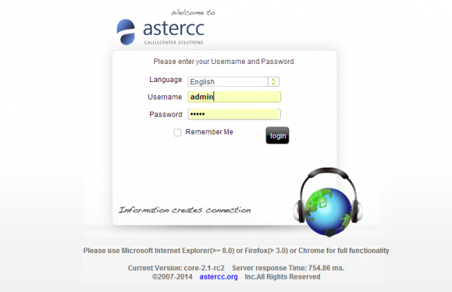 • After installation, enter the server ip in your broswer, such as: http://192.168.1.110, 192.168.1.110 is the IP of astercc server, the default system administrator user & password is admin and admin.