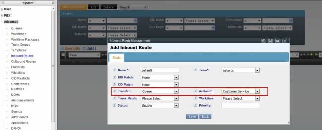 Inbound route is used to route a call by DID, trunk or time condition, here we add a default route so all incoming calls will be routed to the queue we created above.