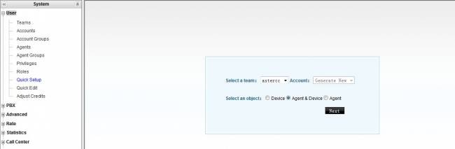 • On the left menu, click [User] → [Quick Setup], go to qucik setup page, we can add a batch of account, device and agent.