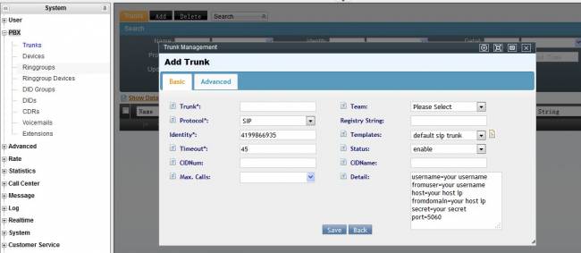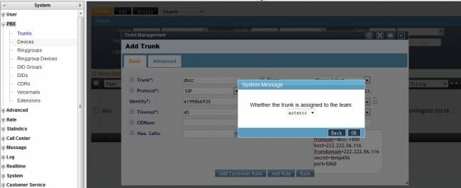 • Click [Save] then it's done, if you didn't select team for this trunk, it will prompt if you want to config this trunk as the default outbound trunk for a team, click [OK], means the team astercc will use this trunk as the default outbound trunk.