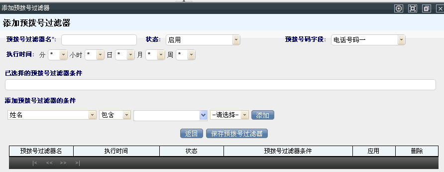 我们看到,执行时间后面有分、小时、日、月、周五个选择框,当所有的方框内都默认为“*”不进行选择的时候,那说明这个过滤器一直处于执行状态,对于预拨号列表里已经存在相同号码的客户将不会被导入