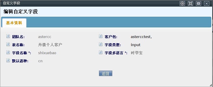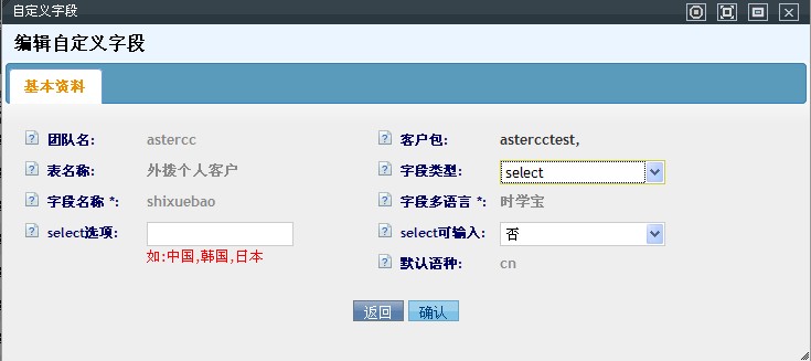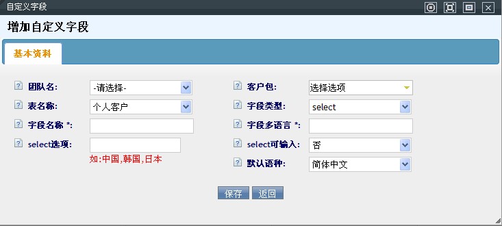 此模块作用是:系统为 两个客户信息总表 和 相应团队下的客户包建立一些 常用字段,当您遇到特殊客户资料群时,系统默认字段就满足不了数据录入了,这时您只需在此模块为相应的表增加所需字段即可。