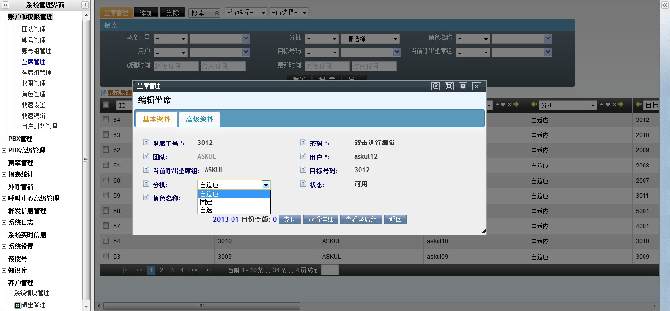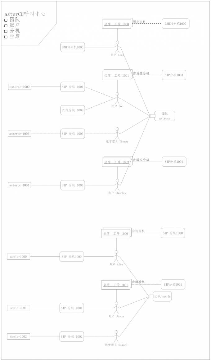 在asterCC商业版系统中,系统由团队、账号、账号组、分机、坐席、坐席组、坐席组管理员、坐席分机、坐席工号、坐席密码等几个概念