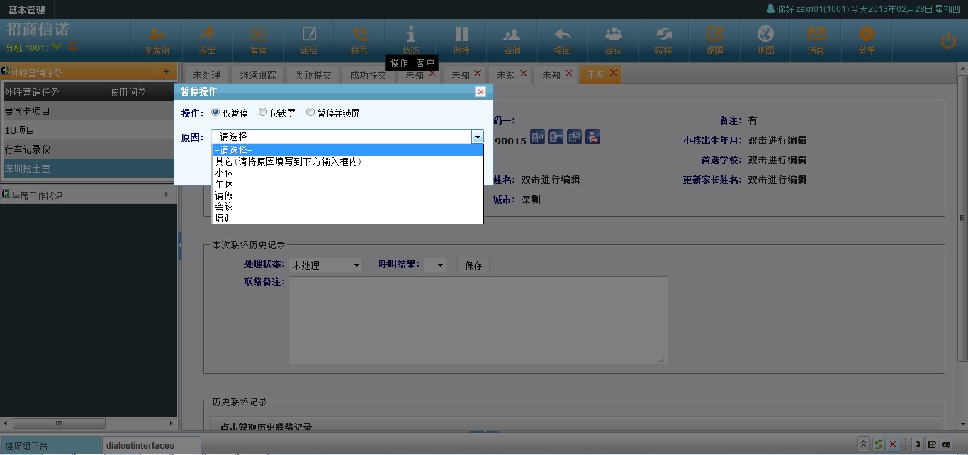 只有在话后和空闲状态时,坐席才能使用暂停功能