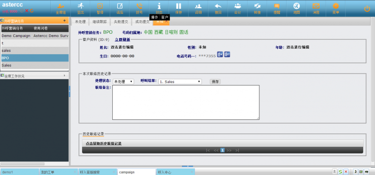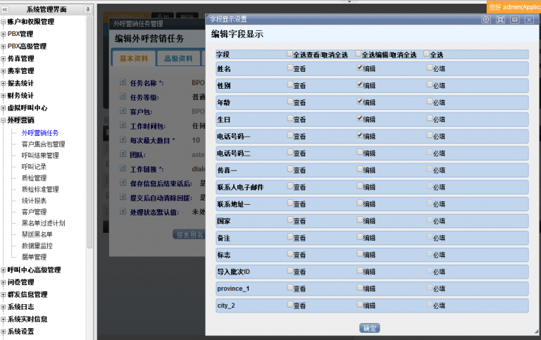 asterCC的外呼营销模块中,用户可以通过“后台字段显示设置”和“前台字段显示设置” 来控制不同地方显示的客户信息以及权限