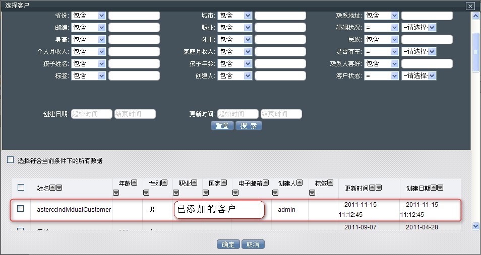 为客户包添加客户,选中每条数据前的选择框,然后点击确定就会将选中的客户添加到客户包里,如下:
