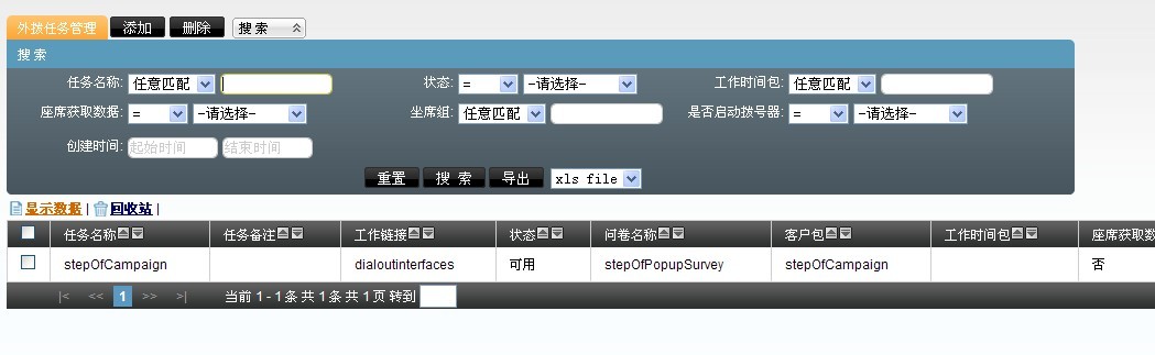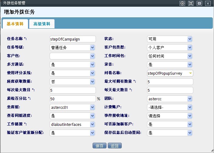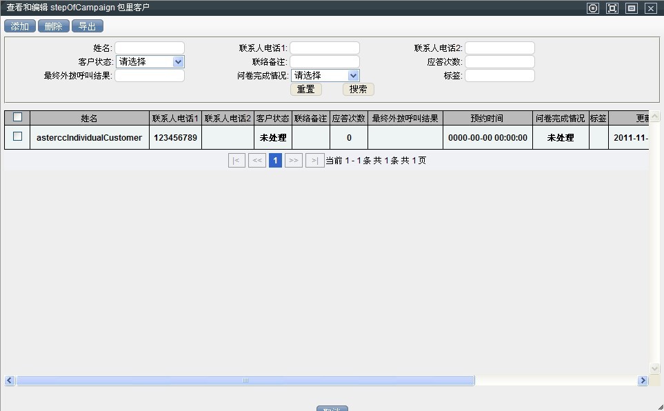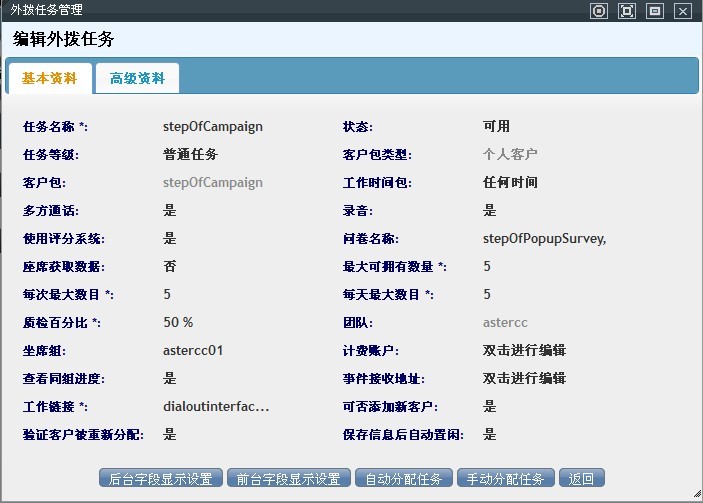 总结: 设置完成以上步骤后,已经创建了一个外拨任务 ‘stepOfCampaign’ 已经绑定一个问卷 ‘stepOfPopupSurvey’ 和一个主叫号码绑定 ‘asterccCampaignStep’, 客户包 ‘stepOfCampaign’ 已经添加了一个客户 ‘asterccIndividualCustomer’。