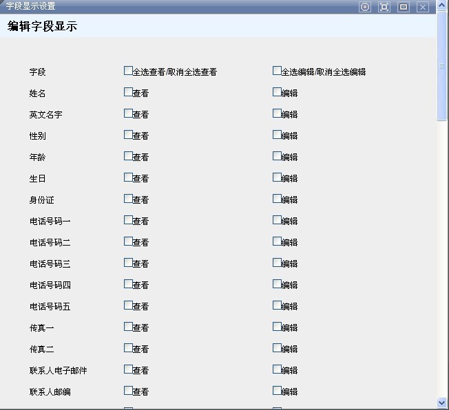 可以通过 后台字段显示设置 按钮和 前台字段显示设置 按钮来控制 客户表字段的显示。 点击 后台字段显示设置 按钮设置后台字段显示。 点击 前台字段显示设置 按钮设置前台字段显示。