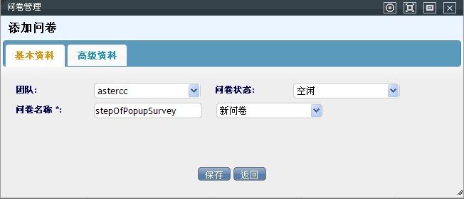 为拨号计划创建一个问卷,打开左侧列表问卷管理模块,会看到问卷管理链接,点击后会进入问卷管理页面,点击页面上的添加按钮。 添加界面如下: