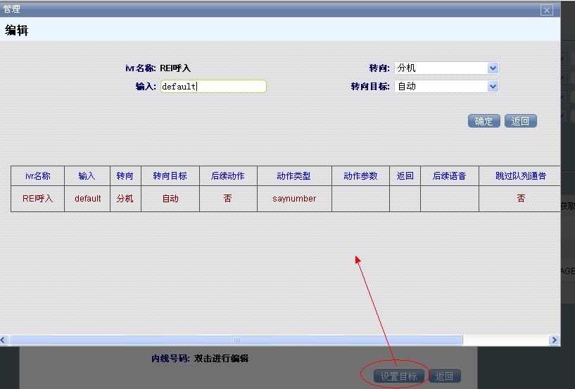 保存后,右下角会出现【设置目标】按钮,作用是当来电者输入分机号后,告知系统要进行什么操作。