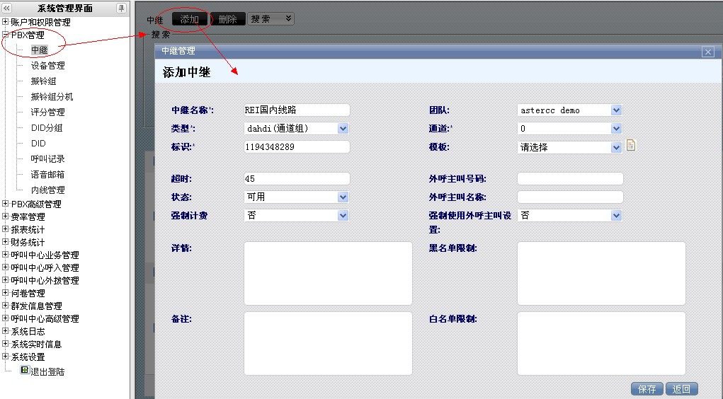 进入asterCC管理系统,在左侧列表依次选择PBX管理–>中继