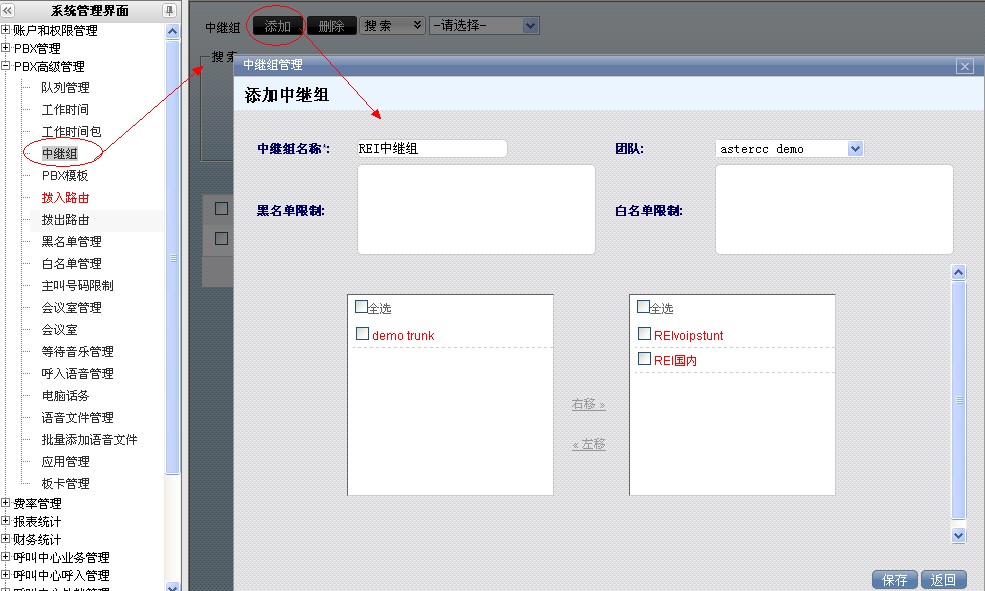 进入asterCC管理系统,在左侧列表依次选择PBX高级管理–>中继组