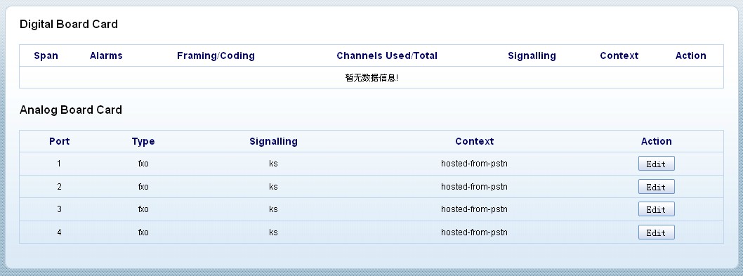 进入asterCC管理系统,在左侧列表依次选择PBX高级管理–>板卡管理