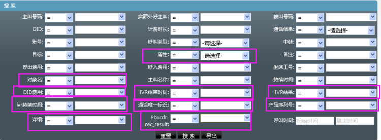 下面将以[PBX管理]→[呼叫记录]页面的搜索栏为例进行说明: