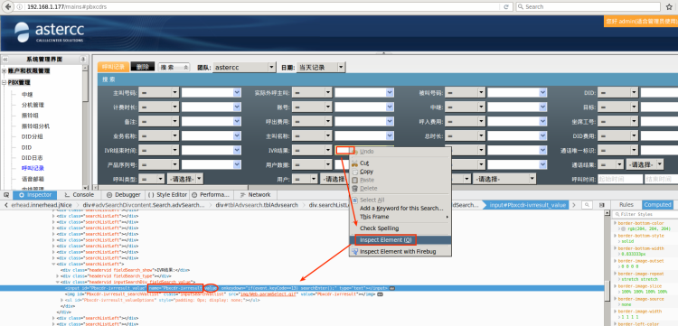 例如:你想隐藏该页面搜索栏中 “IVR结果” 字段,首先将鼠标点击该字段后面的填写框内,右击选择:Inspect Element。你会在下面发现 name=“Pbxcdr-ivrresult_value”,如下图: