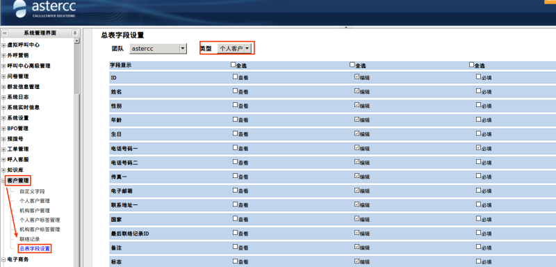 2.[客户管理]→[个人/机构客户管理]页面中搜索栏字段,是由 [客户管理]→[总表字段设置] 页面进行控制的,无需对数据库表进行操作,如下图。对应数据库表是:cc10_customer_fields