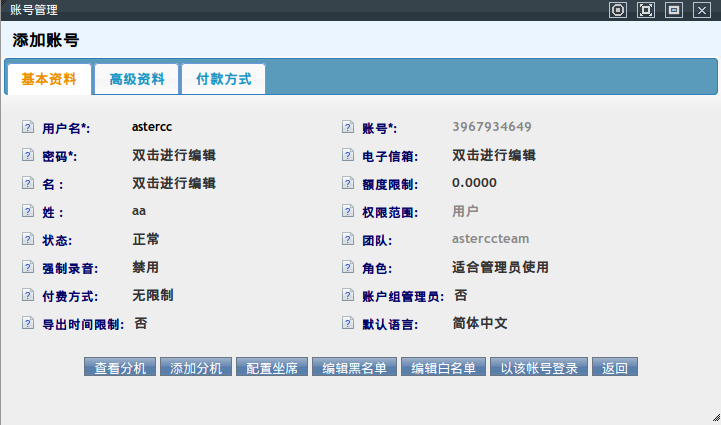 我们进入数据列表,双击一条信息,会弹出一个界面,在这个界面中你可以对账号进行编辑修改。
