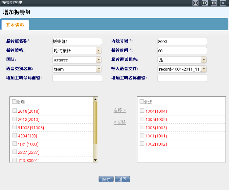 • 界面右侧的方框里即是所有振铃组里包含的分机,也可以进行勾选移除,然后点击“左移”移除该振铃组。