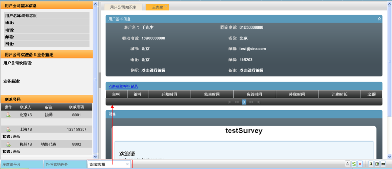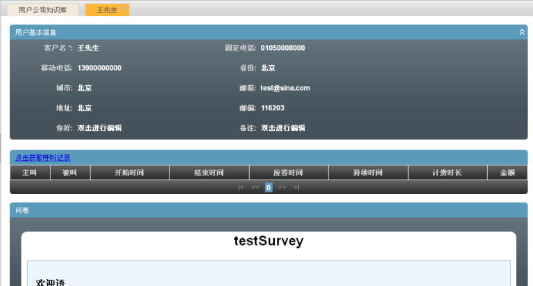 客户资料双击可以进行编辑修改。 【点击获取呼叫记录】,可以看到该客户与呼叫中心的所有联络记录。 如果用户设置了问卷,坐席需要客户配合完成该问卷。