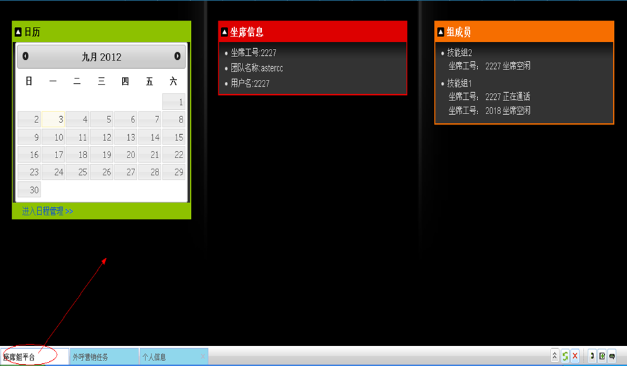 坐席组工作页面,分为三栏:日历日程,坐席信息,坐席组成员。