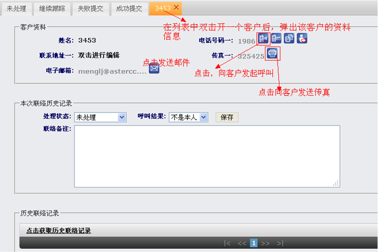 点击获取客户的历史联络记录,该记录是这个客户在此计划中所有的联络信息。是以客户为单位查看,而不是坐席。