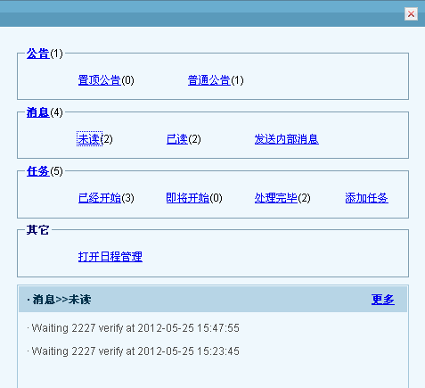 此按钮始终亮起,用于查看系统公告,消息,任务以及日程管理信息。