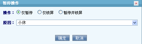 点击暂停按钮,会弹出暂停操作对话框。无论暂停还是锁屏,都需要选择原因。锁屏是将屏幕遮罩住,防止他人操作你的工作平台。