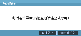 系统未检测到分机设备,如果你核实电话已经连接到系统,你可以点击忽略并签入按钮,同时告知管理员检查系统进程。如果电话确实未连接,请点击取消签入按钮。