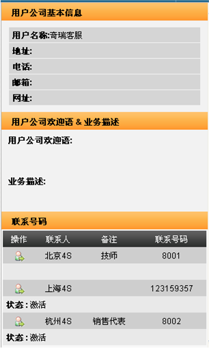 页面左侧显示用户公司的基本信息,欢迎语(用户公司指定坐席的开场白)及业务描述 。
