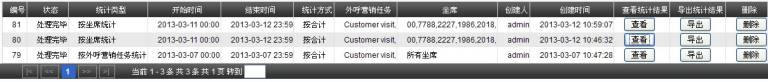 统计任务建立完毕后,会显示在下方表格内,点击【刷新统计列表】查看统计进度。(当状态=处理完毕时,便可查看统计结果或导出统计结果)