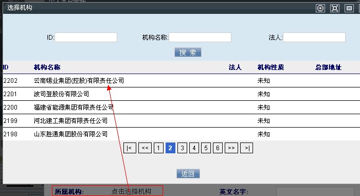 点击选择所属机构,打开机构展示列表,鼠标左键双击目标机构,即为选中。