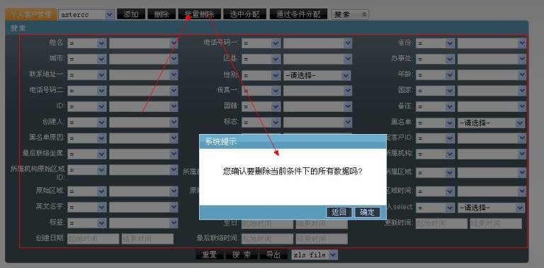 根据当前搜索区域内的搜索条件,查找相关客户并删除。如果你未设置任何搜索条件将删除表内所有客户信息。