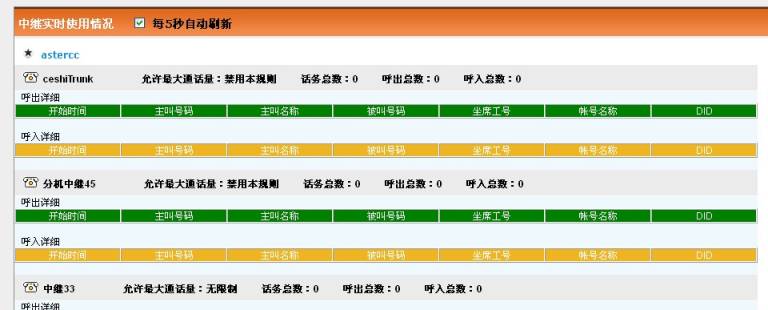 页面信息默认每5秒自动刷新一次(不需要刷新时,需取消“5秒刷新”的选中状态),显示当前中继线路发生的通话信息。