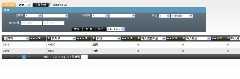如果选中页面上 【立即刷新】按钮 后面的 选择框,那么页面每30秒自动刷新一次,更新在线坐席数据;点击【立即刷新】按钮,可以立即获得最新的在线坐席实时信息;
