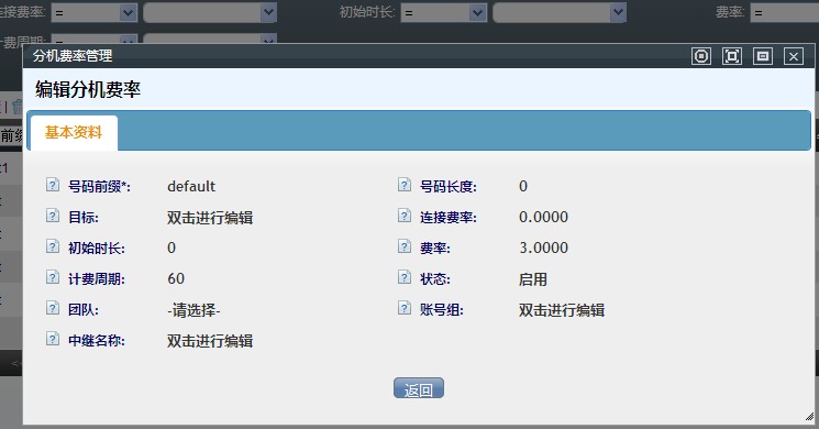 号码前缀: 该费率所匹配的被叫号码前缀,例如用”0”表示国内长途,”00”表示国际号码,”001”表示美国,使用”default”表示可以匹配任意号码,
