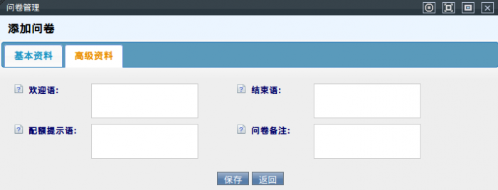 左侧管理列表,点击[问卷管理]→[问卷管理]→[添加],打开问卷添加页面,如下图: