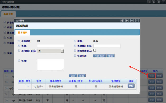 在问题编辑页面,每个问题(单选题,多选题,组合题)后边都有一个选项【添加】按钮。点击此按钮,打开选项添加界面。